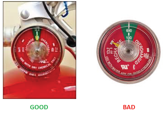 The picture above is what you can look for when inspecting fire extinguishers. You want the gauge to be int he green area, not in the red. If you see one not in the green space, take it out of service immediately.