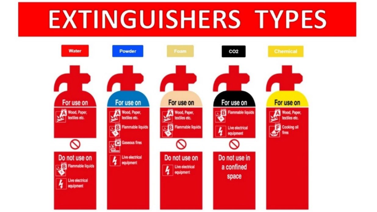 Here are some examples of different types of extinguishers and when to use them. (ABC rated ones are Powder)